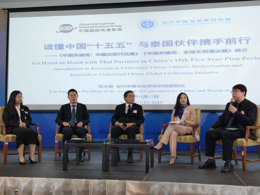 在圆桌讨论环节,范大祺、泰国前驻广州总领事瓦信、泰国中国总商会主席刘全雷、广汽国际泰国战略合作总监达红娟、中国人民大学教授许勤华等中泰两国专家学者及企业商会代表展开深入交流。范大祺结合“十五五”规划重点推介《中国关键词:中国式现代化篇》《中国关键词:全球文明倡议篇》等系列图书成果。他表示,“十五五”时期将是中国实现现代化的关键阶段,在科技创新、绿色发展、数字经济等领域的深化布局,将为中泰合作带来更多机遇。“中国关键词”多语种图书将为泰国受众深入理解中国“十五五”规划的创新举措与改革方向提供参考。