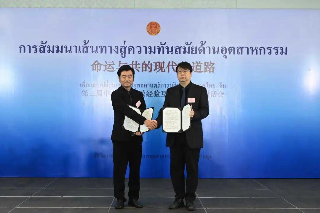 范大祺(右)与亚太智库主任威伦(左)互换《中国关键词:中国式现代化篇》泰文版翻译出版合作协议
